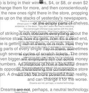 The messages invite the viewer to reflect on the combination of technology, economics, politics, and fantasy that produce the actual experience of a place, as well as the forces that attempt to package that experience, and sell it back to you.
