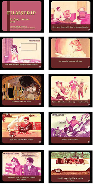 An educational filmstrip for young adults about the perils and absurdities of modern relationships. Using the imagery and format of 1960s elementary school filmstrips, Filmstrip tackles infidelity, open relationships, California, Burning Man: all those things you wish you had been taught in school.